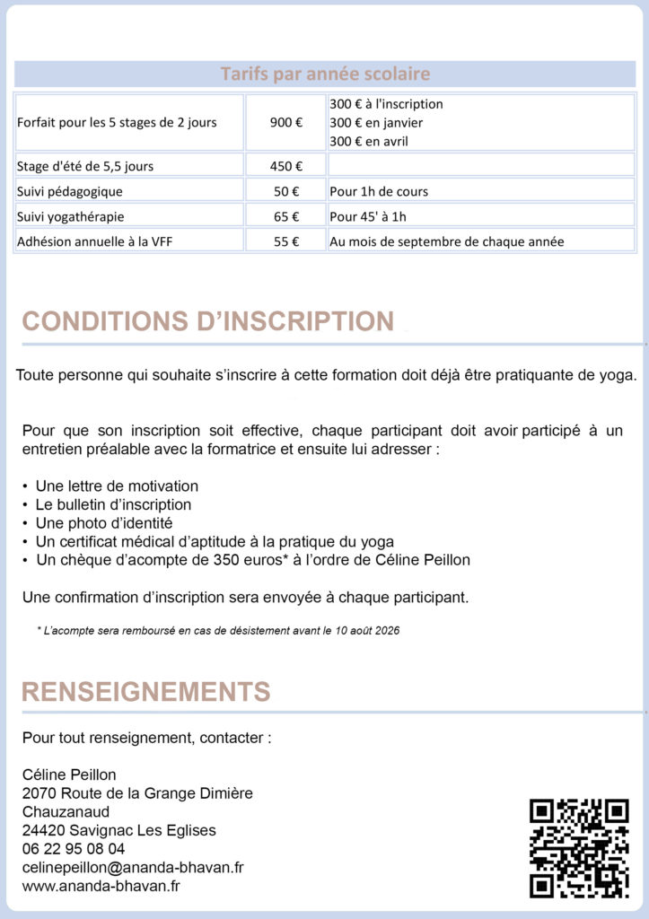 Une formation de professeurs de yoga a débuté en septembre 2023 et se terminera en septembre 2027.